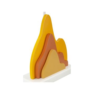 Lampada da tavolo in legno dal design che richiama una fiamma. completa di paralume in tessuto giallo/arancio.