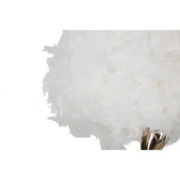 Lampada da tavolo in metallo dorato dal design design morbido e sinuoso, completo di paralume con eleganti piume sintetiche.