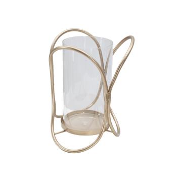 Portacandele in metallo dorato con bicchierino in vetro dal design geometrico e dalle linee morbide e sinuose.