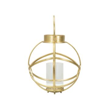 Portacandele in metallo dorato con bicchierino in vetro dalla struttura geometricamente squadrata e lineare.