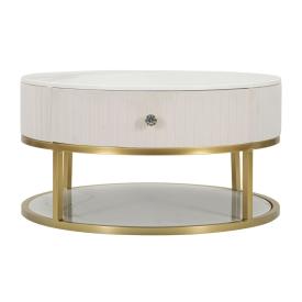 Tavolo da caffè rotondo in metallo dorato con piano in vetro con lavorazione simil marmo. il design lineare ed il contrasto tra l...
