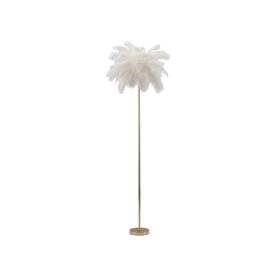 Piantana in metallo dorata formata da tre aste e paralume composto da piume bianche.