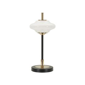Lampada da tavolo in metallo dorato con paralume in tessuto nero. la lavorazione della base, semplice ed elegante, ed il contrasto...