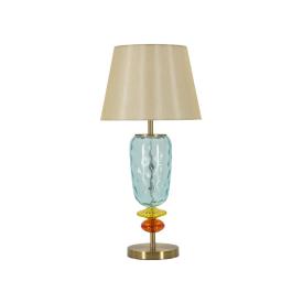 Lampada da tavolo in resina con eleganti decorazioni lineari in rilievo. completa di paralume in tessuto beige.