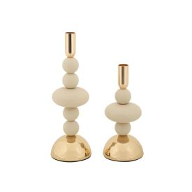 Portacandele in metallo dorato con base in marmo bianco dal design lineare e geometrico e dalle linee morbide e sinuose.