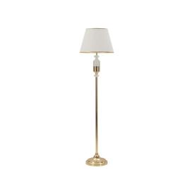 Piantana in metallo dorato dalle linee semplici con elegante sfera paralume in vetro bianco.