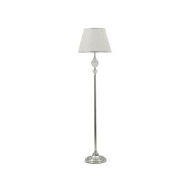 Piantana in metallo dorato con elegante decorazione trasparente e con base rotonda. completa di paralume in tessuto bianco con bor...