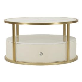 Tavolo da caffè rotondo in metallo dorato con piano in vetro. sotto il piano sono presenti delle elegantissime decorazioni a form...