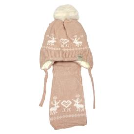 Morbido set invernale composto da berretto con pon pon, che presenta un orsetto ricamato, e sciarpa coordinata.