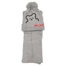 Morbido set invernale composto da berretto con pon pon, che presenta un orsetto ricamato, e sciarpa coordinata.