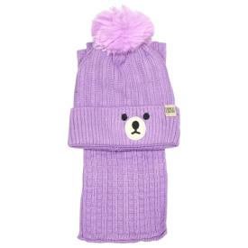 Morbido set invernale composto da berretto con pon pon, che presenta un orsetto ricamato, e sciarpa coordinata.