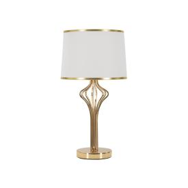 Lampada da tavolo in metallo dorato con elegante decorazione geometrica completa di paralume in tessuto bianco con bordo dorato.