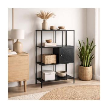 Scaffale a 4 ripiani nero con cassetto, realizzato in legno mdf e metallo, unisce funzionalità e design minimal.