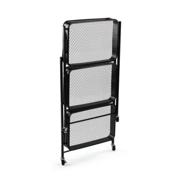 Carrello pieghevole in metallo nero, ideale per ottimizzare gli spazi in cucina.