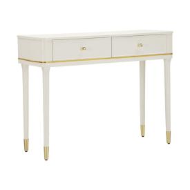 Console rettangolare in metallo dorato con piano in vetro a specchio dalle linee semplici ed essenziali.