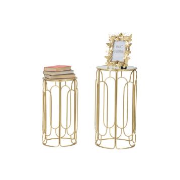 Elegante coppia di tavolinetti rotondi in metallo dorato con piano in vetro a specchio dalle linee geometriche e arrotondate. il p...
