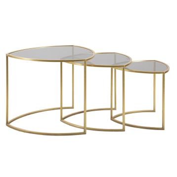 Set di tre tavolinetti triangolari con angoli smussati con struttura in metallo dorato e piano in vetro