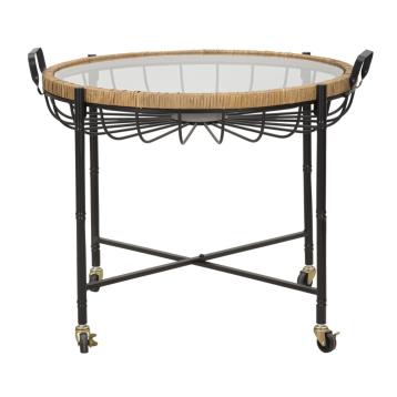 Tavolo basso rotondo con struttura in metallo nero e piano in vetro incorniciato in un intreccio di rattan. pratiche rotelle ne fa...